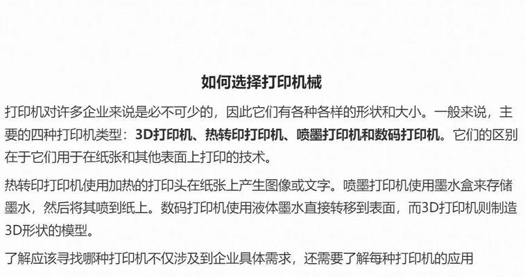 在今天的信息时代,打印机成为了我们工作、学习中不可缺少的重要设备。但是,面对琳琅满目的打印机品牌和型号,我们往往会感到困惑,不知道该如何选择和使用。为了让大家更好地了解打印机相关知识,本文将从打印机的基本原理、分类、选购、安装和维护等方面进行详细介绍。