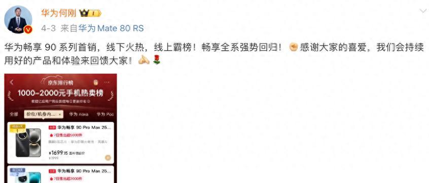 华为终端BG CEO何刚亲自发声,说畅享90系列“线下火热,线上霸榜”。这种级别的表态,基本就意味着:不是卖得还行,是卖得很好。